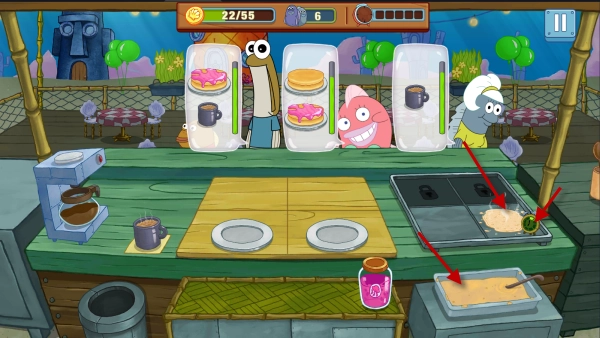 以这个煎饼为例,点击面糊后会将其放入煎锅,待绿色计时器走完,就能把煎饼取出来了。