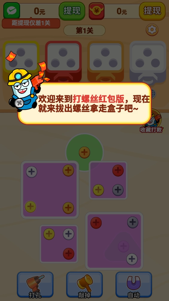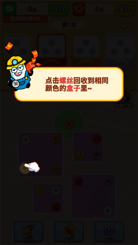 跟随新手教程将螺丝回收到相同颜色的盒子里。