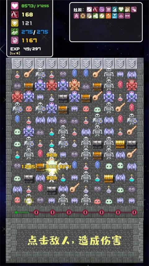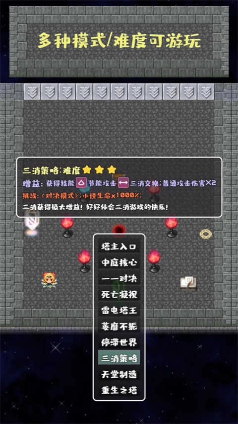 转生魔塔是一款休闲像素风冒险游戏,巧妙融合了肉鸽、策略塔防与三消元素,打造出极具趣味性的游戏模式。在游戏里,玩家需探索地牢魔宫的各个角落,击败其中的魔物,还能通过学习技能增强自身战斗力。