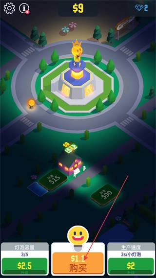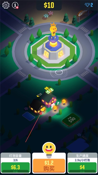 游戏开始时会发放10金币作为初始资金,点击下方的购买按钮即可生产小灯泡。