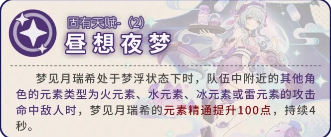 在【梦浮】状态下,会依据梦见月瑞希自身的元素精通数值,对队伍里处于附近的角色触发扩散反应所造成的伤害进行提升,具体的提升比例是每1点元素精通对应增加0.42%的扩散伤害。