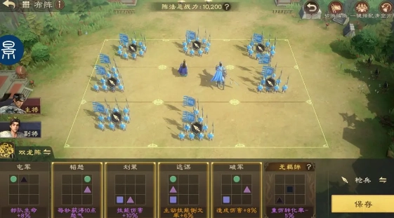 双龙阵(可提升暴击率与技能伤害),在选择阵型时,优先考虑韬怒、励军、出奇这几个。
