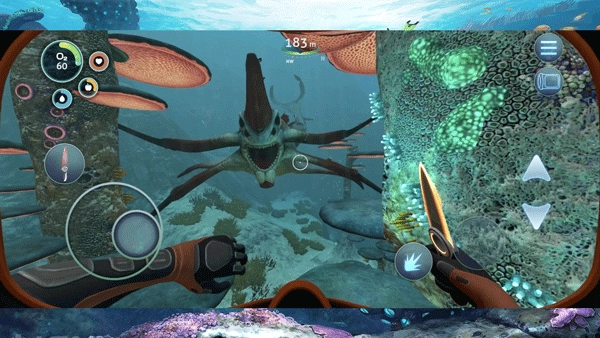 探索——管理自身的饥饿、口渴与氧气供给,潜入挺拔的海带森林、阳光灿烂的高原、发光的珊瑚礁以及曲折的洞穴系统。
