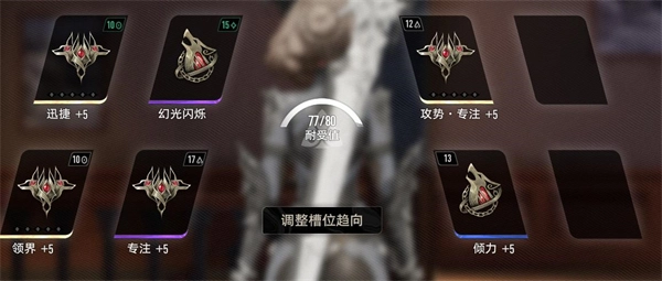 魔之楔的耐受数值右侧设有一个图标,用于标识其趋向类型。除无类型外,共有三角、月牙、菱形、圆圈四种趋向。在魔之楔装备界面中,可通过点击调整槽位趋向的功能,更改任意装备格的魔之楔趋向设定。当在已调整趋向的装备格上安装魔之楔时,若两者趋向一致,耐受值消耗将减半;若趋向不同,则耐受值消耗会增加25%(计算结果需向上取整)。到了游戏后期,紫色和金色品质的魔之楔可能会出现20点以上甚至30点以上的耐受值,此时调整装备格的趋向就变得十分必要,否则耐受值上限必然无法满足需求。