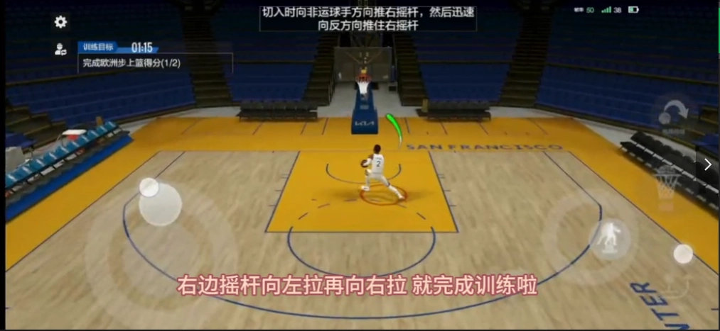 欧洲步训练要点:选择运球能力强的球员,明确其右手持球状态。启动时需先适当后撤,再全力冲刺跑以获得向前冲的惯性。操作右边摇杆时,按持球手反方向(右手持球对应先左后右),先向左拉再向右拉,拉至右侧时务必保持摇杆位置固定,不可回弹,即可完成动作训练。