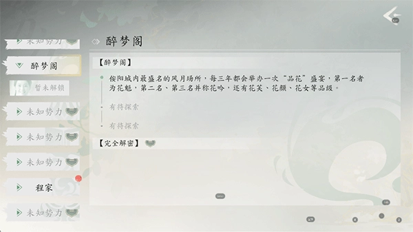 在已解锁的势力档案里,你能知晓当下的时代背景与人际关系,从而更深入地理解游戏世界。