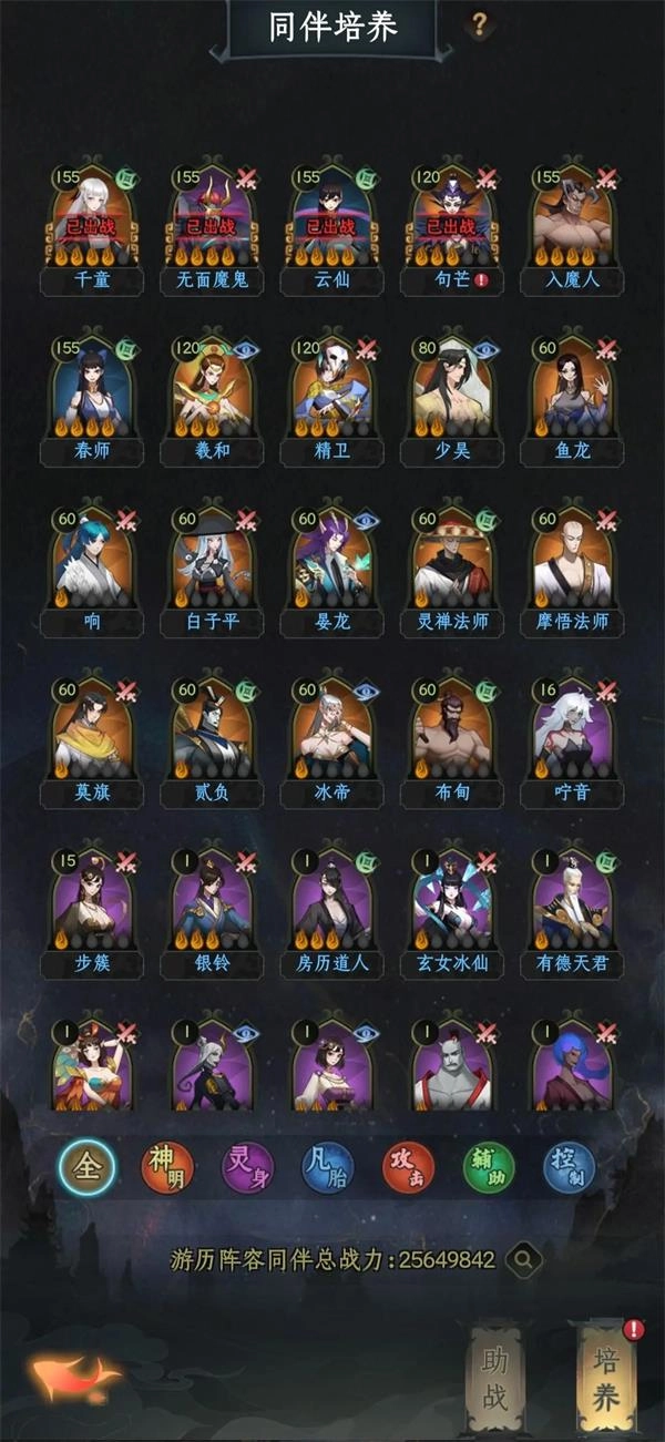 神明的升星材料(橙色魂火)切勿随意使用,务必优先培养千童、鬼仙人与句芒这三位角色。