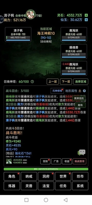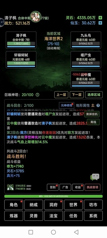 化身达到一定境界后就能开启夺舍功能,不少玩家觉得化身没什么用处,其实并非如此——我作为合体境修士能打到100层,化身在其中起到了关键作用。完成夺舍后,挑战BOSS时化身可以补充输出,这些额外输出要是靠单独挂机提升,可能得耗费好几个小时。通过这种方式打过更高级的地图,再用更高级的属性进行夺舍,就能形成良性循环;到了实在打不过的时候,我还能带着分身去挂更高级的地图。举个例子:我现在单独挂机刷90-10关卡需要三回合,但带上化身刷75-10关卡只需要两回合,收益反而比90-10高很多,战力提升自然也更快。当然,也可以根据化身的输出情况来调整自己的灵根,只要化身刚好能实现秒杀就可以了。