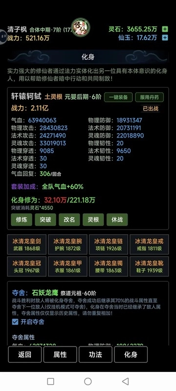 化身,在达到对应境界后要第一时间开启;夺舍功能只要能用了,就记得一直保持开启状态。