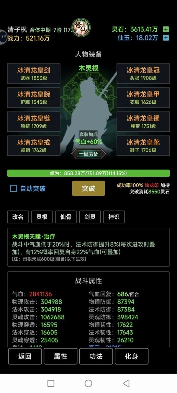 灵根选择时,我挑了木土组合,五张图算一个循环,最后一张图是土属性的。化身的灵根选的是土,技能带了个增益效果,虽说作用不大但总比没有强。忍不住吐槽一下:化身的属性克制和人物灵根本该关联更紧密些,现在这样设计感觉不够严谨。