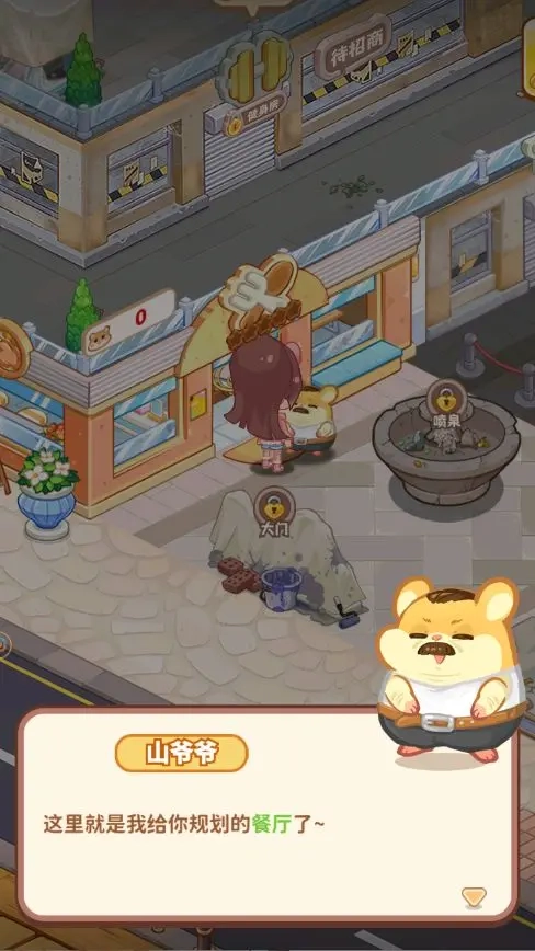 解锁第一家店铺:进入游戏后,山爷爷会协助我们开启第一家店铺——餐厅。这家餐厅坐落在商业街临街的首个铺面,往来人流密集,很适合新手店长熟悉经营流程。