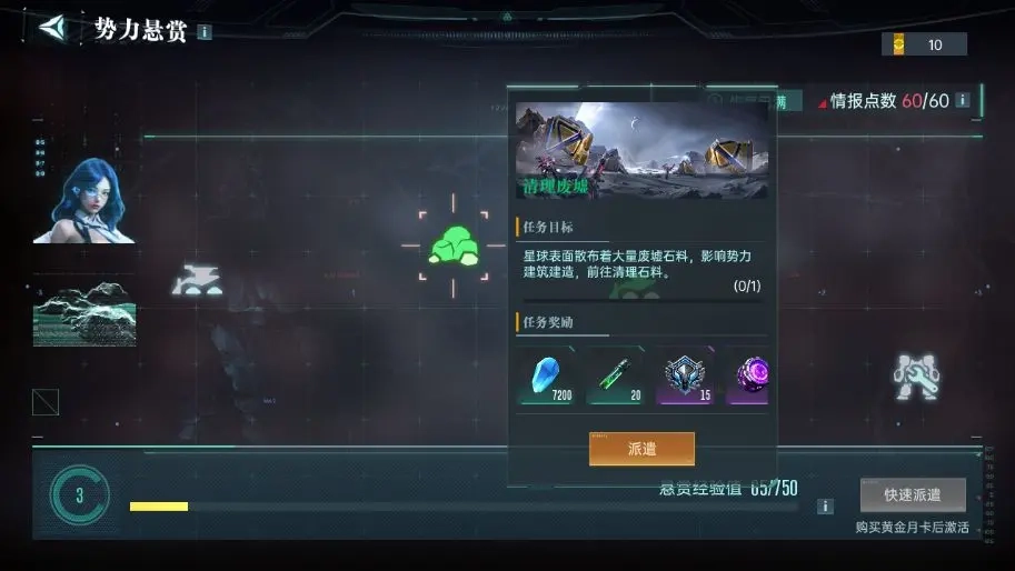 每日的势力悬赏一定要完成,因为随着势力等级的提升,能为玩家带来大量英雄经验和各类资源。每次完成悬赏任务会消耗1点情报点,情报点最多可以囤积60点,记得不要超过这个上限哦~