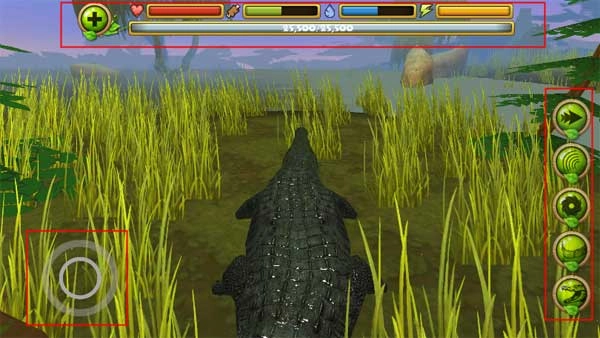 进入游戏后,玩家将化身为鳄鱼开启冒险。屏幕左侧设有控制移动方向的按键,右侧则是用于发起攻击的按钮,而界面上方会显示角色的血量、饥饿值等关键状态信息。