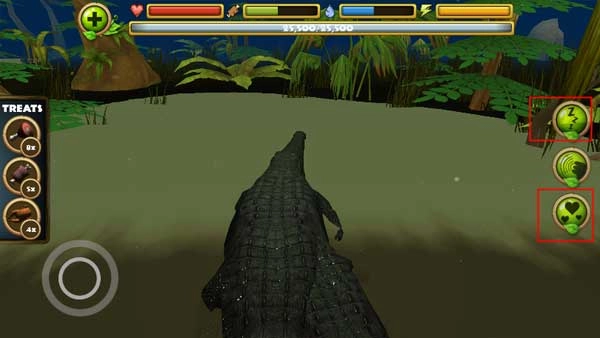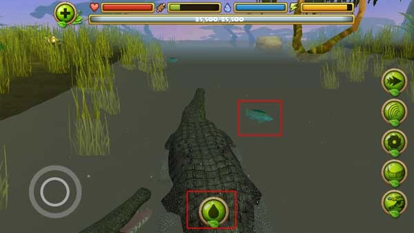 当鳄鱼进入水中时,会自动出现一个按钮,你需要通过捕食来补充能量,同时要小心附近其他动物的侵害。