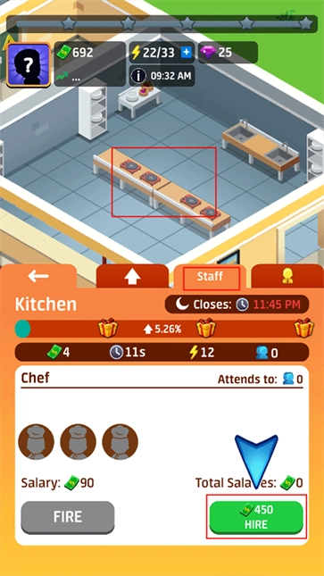 现在我们得赶紧雇个厨师到厨房来!这里有一些现金,你需要点击厨房,找到staff(工作人员)选项,花费450来雇佣新厨师。