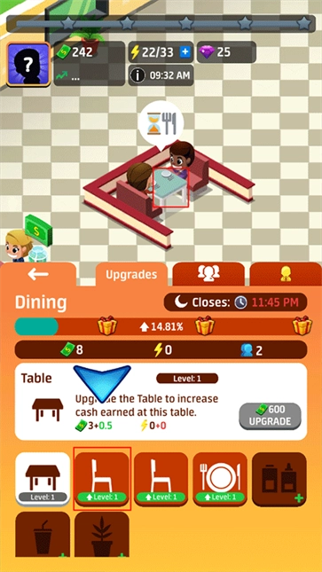 接下来,咱们可以在等待餐品上桌的间隙升级一下用餐的座位设施。等餐桌升级完成后,客人们就能为用餐支付更高的费用了。