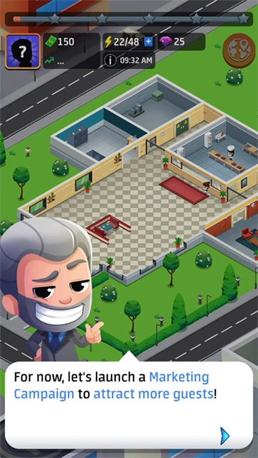 现在,让我们开展营销活动来吸引更多顾客!点击屏幕右下方的“灯泡”图标发送传单,以此吸引更多客人。