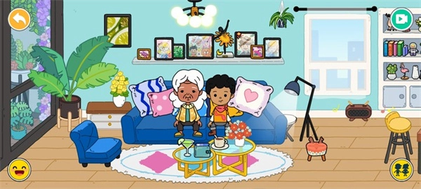 这是谁的家呢?一进门就看到充满温馨感的舒适客厅,那张克莱因蓝色的沙发可是当下的流行款呢。点击人物图标就能召唤城市里的小伙伴,让他们来沙发上歇歇脚吧!看看这个客厅的布局,你家是不是也这么整齐呀?往右边滑动画面还能参观厨房和卧室哦——这里就是妈妈每天为大家做三餐的地方,做饭要用的餐具、食材和调料,你都能认出来吗?