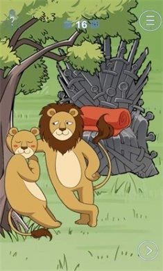 用四叶草吹拂左侧的狮子,随后入座(可选择爬梯子、直接入座,或是用四叶草吹动树冠,取来王冠戴在右侧狮子的头上,静静等待即可)