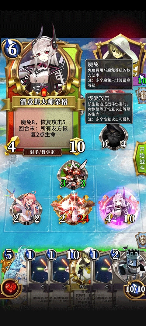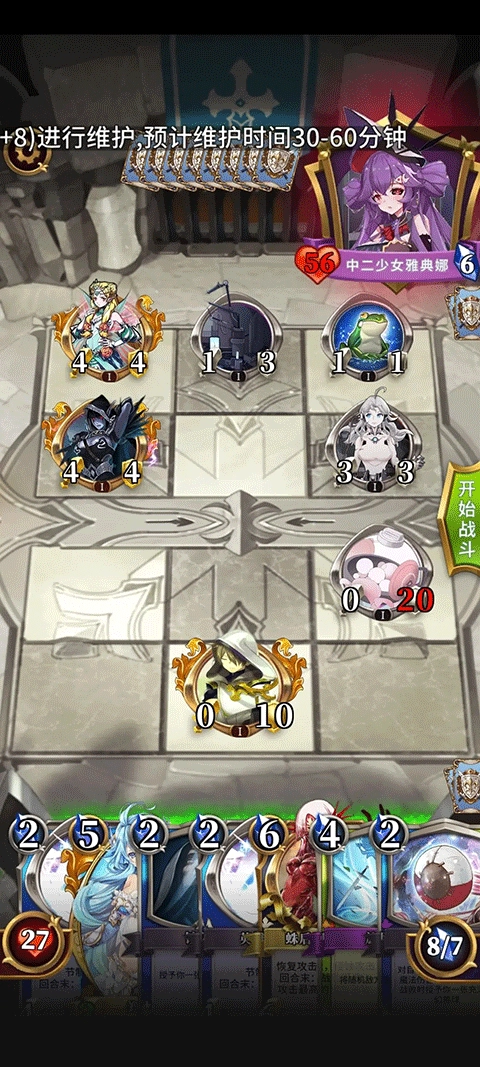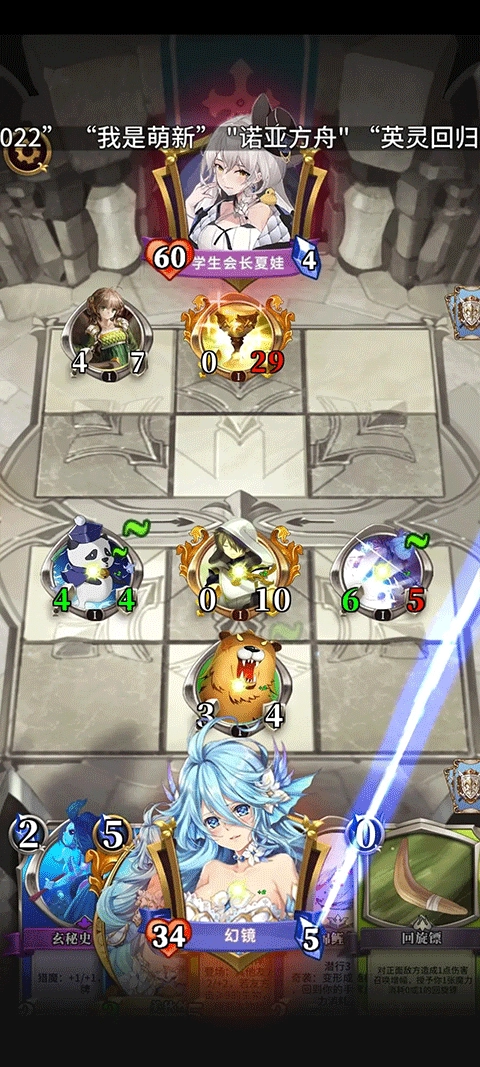 还好,女神前期并没有高攻卡牌,这里推荐使用人鱼,前期采取防守战术,让第一个扭蛋孵化并铺满全场以堵住位置,借助城墙、冰冻、封印、变形等手段拖延时间,直至其他扭蛋孵化。扭蛋消失后难度就不大了,记得把手牌用光,防止被炸血,毕竟此时玩家的血量也所剩无几。下面是效果图: