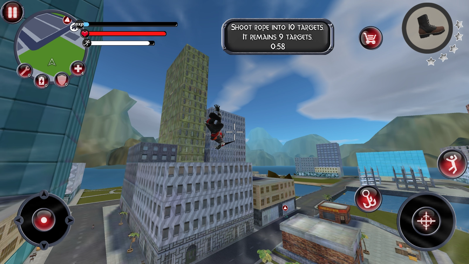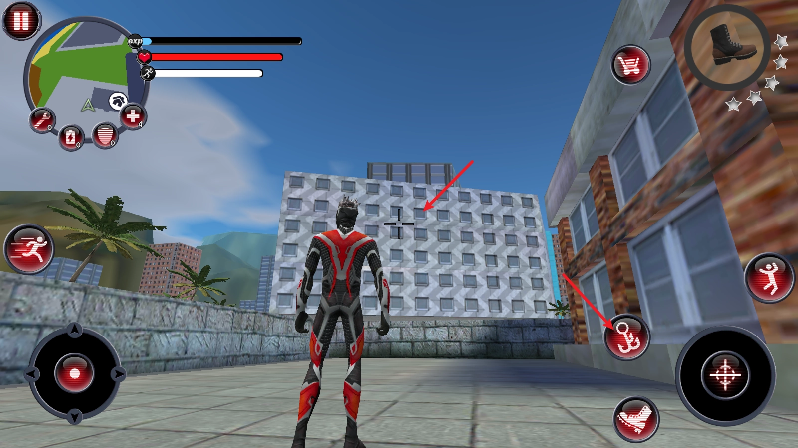 当角色朝向墙壁时,发射绳索的按钮便会出现,按下发射后就能顺着绳索飞向空中。