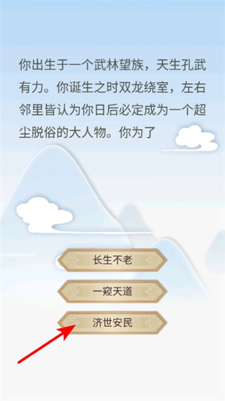 在人生目标选择界面,选定“济世安民”作为修仙目标后,会对角色的发展路径产生影响,同时也能让修仙之路更具方向感。