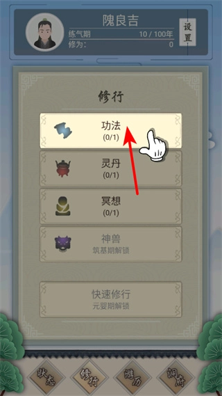 在修炼界面里,点击功法选项就能学习功法以提升战力。功法作为修仙战斗与属性提升的核心,能够帮助你快速增强自身实力。