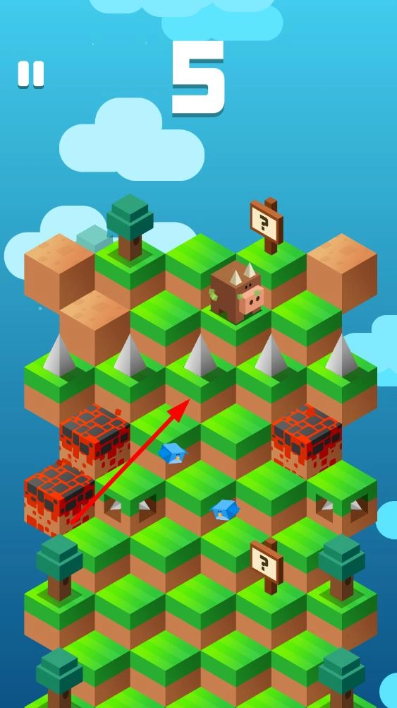 小猪在山坡的最上面,眼前的道路已经铺展开来,得提前做好准备,按照提示开始往下走,要留意避开第一个冒出来的障碍物。