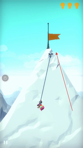 操控角色顺着绳索移动到山顶的旗帜位置,以此达成本关的冒险目标。