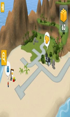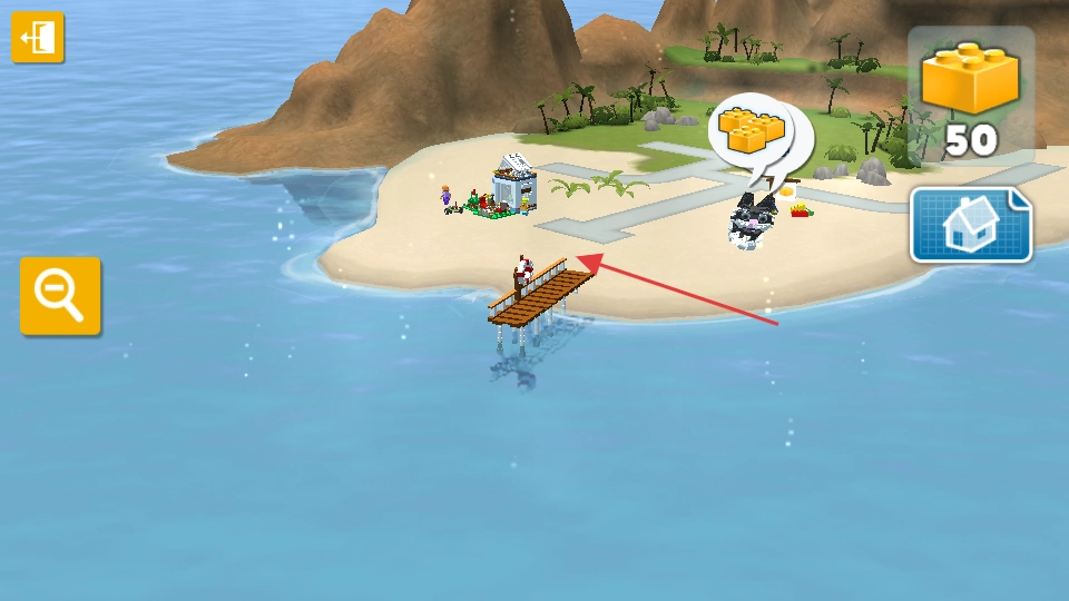 回到岛屿场景,使用剩下的50块乐高积木,按照红箭头的指引前往新区域进行探索,就能找到隐藏的搭建点,不断拓展岛屿上的乐高世界。