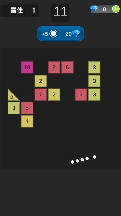 游戏界面的顶部会显示当前得分与钻石数量,点击红色框内的方块矩阵即可消除并获取得分,黄色方块上的数字对应其分值,而白点或许是道具相关的提示。