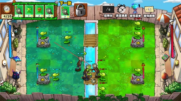 利用已布置好的植物去攻击前来的僵尸,阻止它们靠近房门,与此同时要留意卡牌的数量,随时准备补充新的植物。