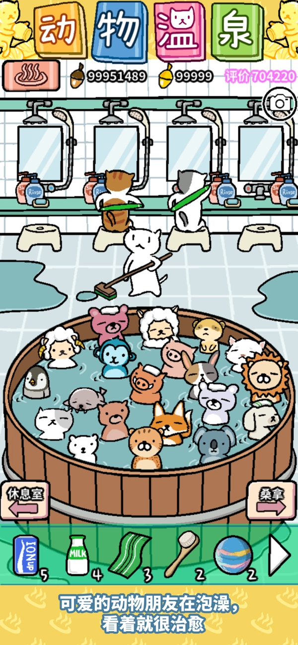《动物温泉》是一款画风温馨治愈的模拟经营游戏,玩家将在动物王国里经营一间浴室,让可爱的小动物们享受泡澡的快乐。游戏里的动物种类十分多样,从娇小的猫咪、老鼠,到体型庞大的狮子、棕熊,都会成为你的顾客。你需要为这些动物安装合适的洗浴设施,帮助它们获得更舒适的体验,还能收到它们的评价与鼓励,玩起来特别有趣。