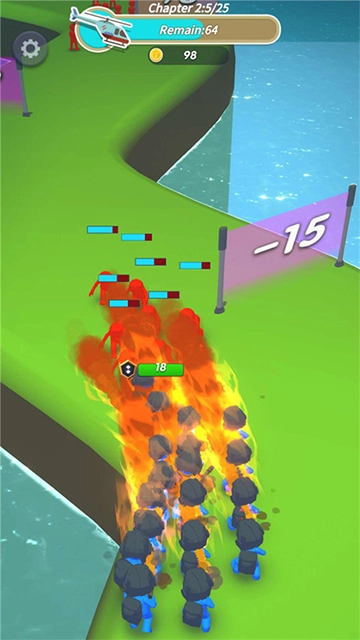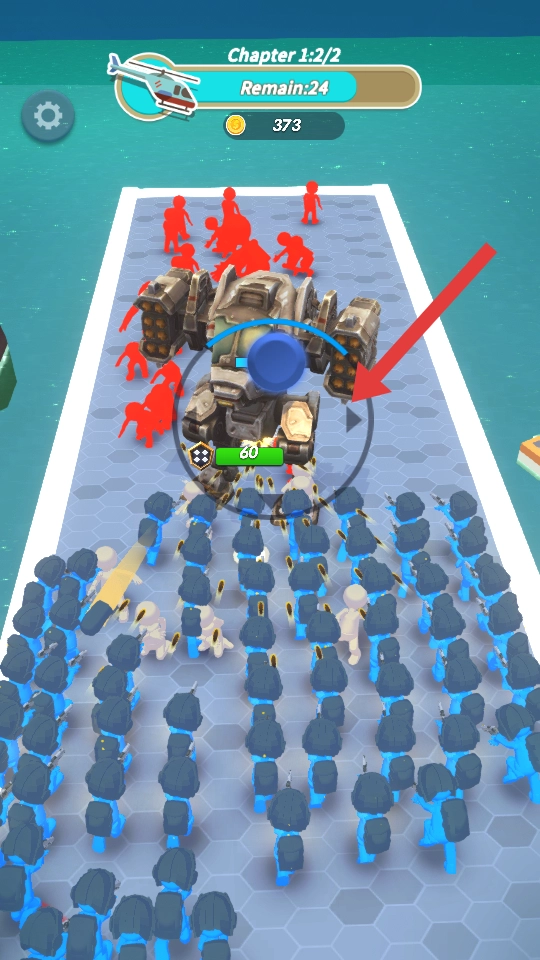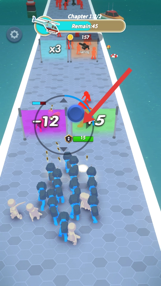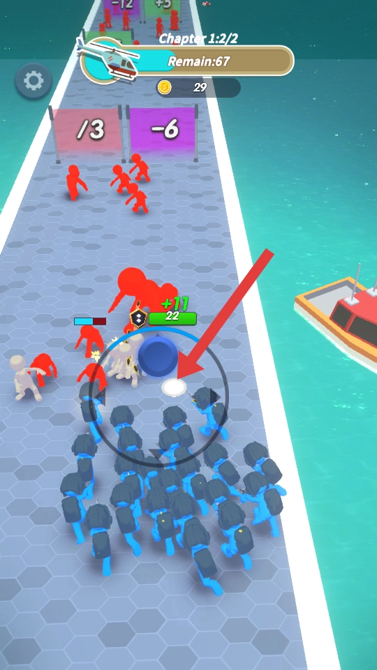 你可以通过滑动屏幕或者点击方向键,来操控蓝色小人这类群体的移动方向,引导他们在场景里行进,前往那些对他们有利的区域。