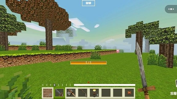 点击快捷栏里的剑武器,靠近僵尸发起攻击,借助草地、坡地等地形进行周旋,击败僵尸后获取资源,以此维持生存。
