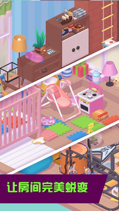 这款游戏整体运用明亮温暖的卡通渲染风格,色彩柔和、光线自然,为玩家营造出轻松愉悦又充满成就感的家居设计氛围。