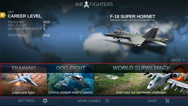 训练备战,投身“世界霸权”模式挑战自我,参与全球同步上线的精彩任务;在“狗斗”玩法中化身飞行王牌,与更强劲的敌方喷气式战机交锋。6种游戏模式任你选择,助你成为顶尖射手;还能为每架战机解锁威力递增的全新武器。