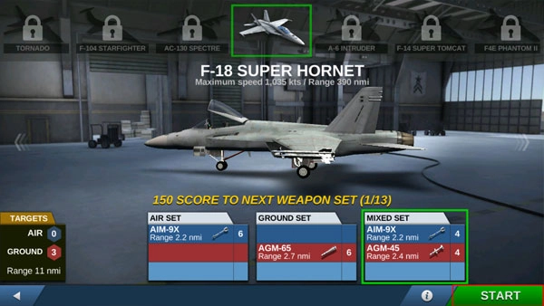 接下来要做的是挑选战斗机,确定飞机的类型以及配备的导弹,之后点击“START”按钮就能开启游戏了。