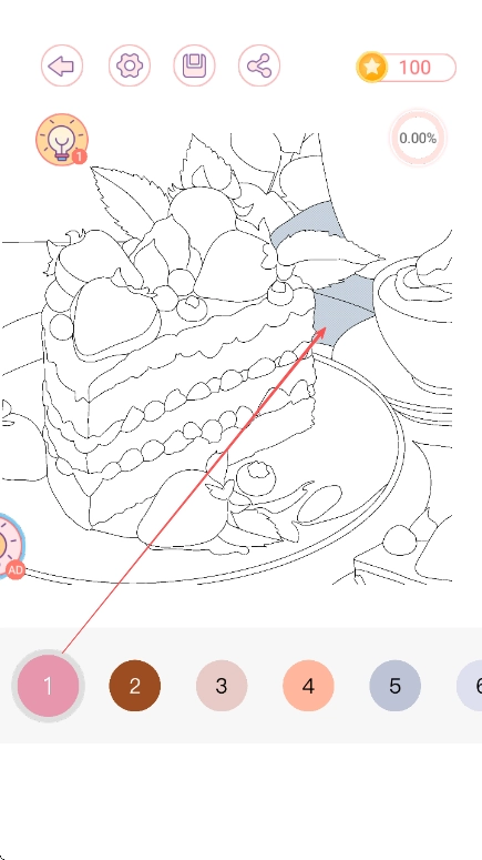 打开游戏后,点击界面下方的1号粉色按钮,接着按照箭头的指示,为蛋糕的对应区域进行上色。
