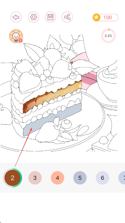 请点击下方的2号棕色按钮,然后按照箭头指示的方向,为蛋糕的另一部分填充上棕色。