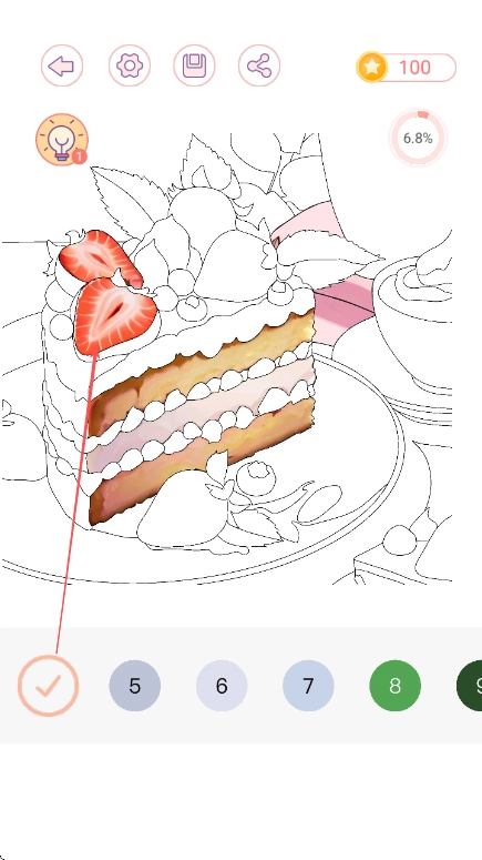 找到带有对勾标记的颜色按钮,然后按照箭头的指示,给草莓的部分进行上色。