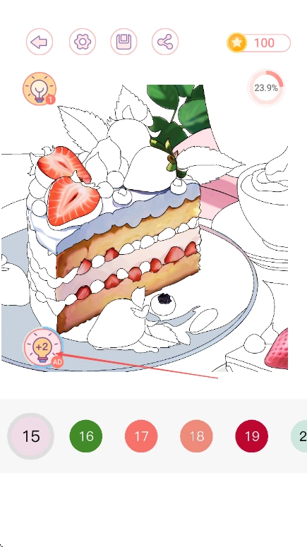 随着上色工作的推进,点击箭头指示的新增颜色按钮,继续给蛋糕及其周边区域涂色。
