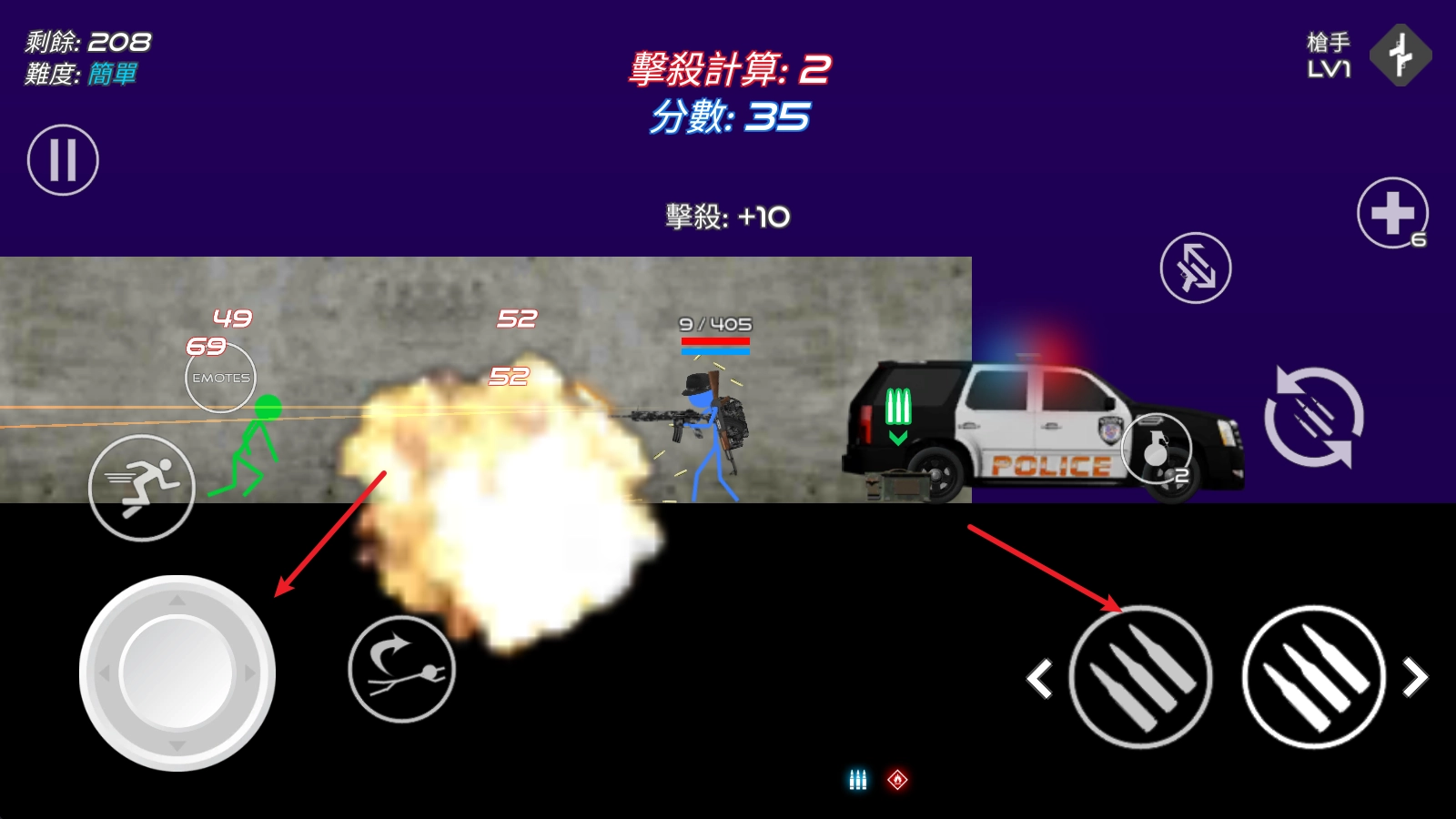 进入后,左侧摇杆用于控制移动,右侧设有左右两个开枪键,分别对应向左开枪和向右开枪的操作。