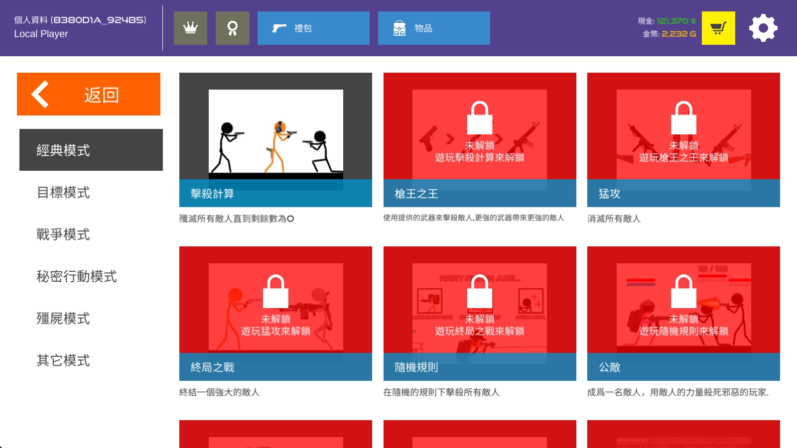 经典模式、目标模式、战争模式、僵尸模式等多样玩法可供自由体验,操控专属火柴人,尽情享受射击的乐趣吧。