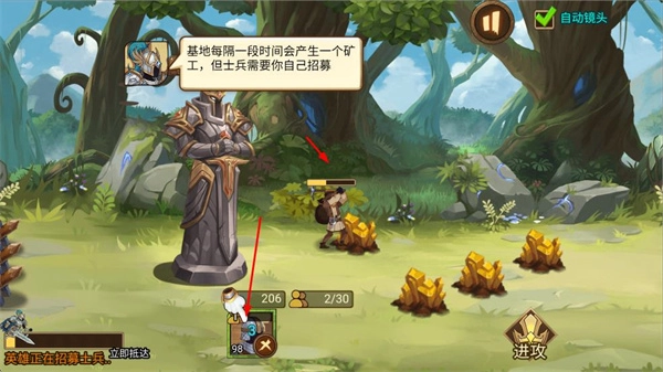 基地会自动产出矿工,玩家要自己招募士兵,组建作战队伍。