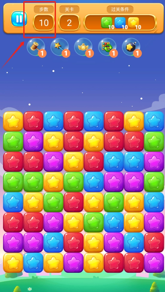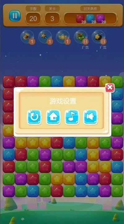 点击功能栏可暂停游戏,拖动星星方块进行消除,收集绿、蓝、黄三种宝石即可过关。