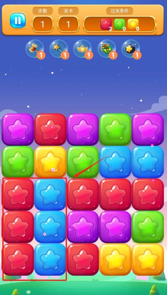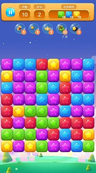 滑动屏幕来移动星星方块,当三个相同颜色的方块凑在一起时就会消除,收集星星以满足过关的条件。