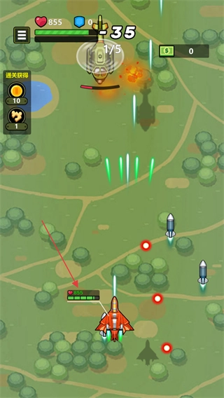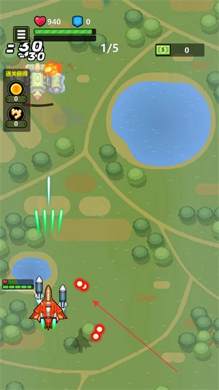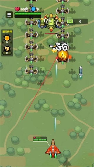 控制红色战机进行移动,主动对敌方战机发起攻击,注意观察屏幕上显示的伤害数值,例如-300-30这样的显示。