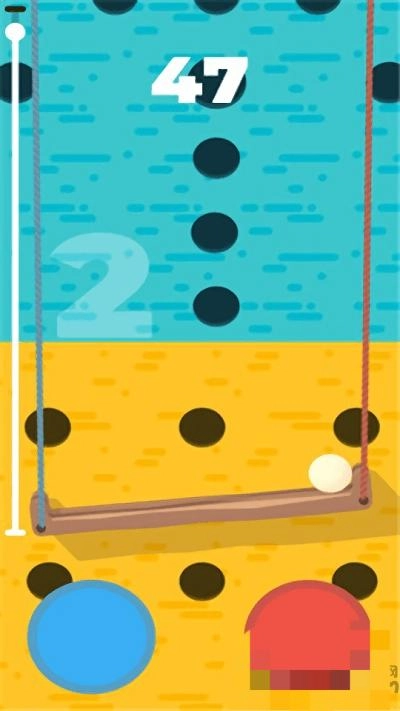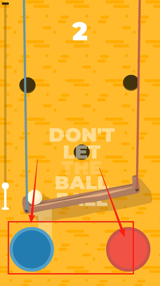 进入第二关后,木板上小球的位置发生了变化,下方出现了蓝色和红色的大圆按钮。当小球滚动时,需要根据它的移动方向,迅速点击对应的颜色按钮,使木板倾斜,从而让小球保持在木板上,避免掉落。