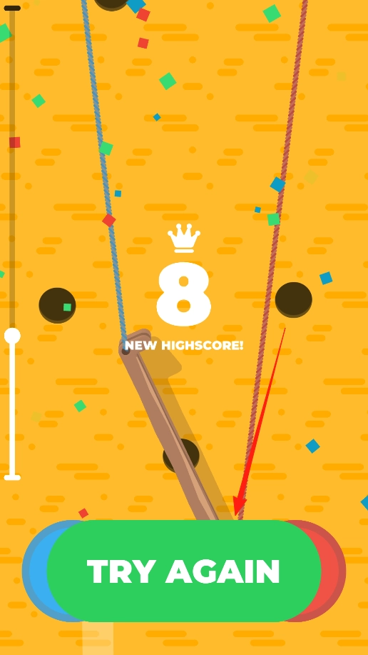 这是游戏结束界面,会显示最终得分和“TRY AGAIN”按钮。当小球掉落时游戏就会结束,要是想重新挑战更高分数、看看这次能不能让小球坚持更久,点击那个绿色按钮就能重新开始游戏了。